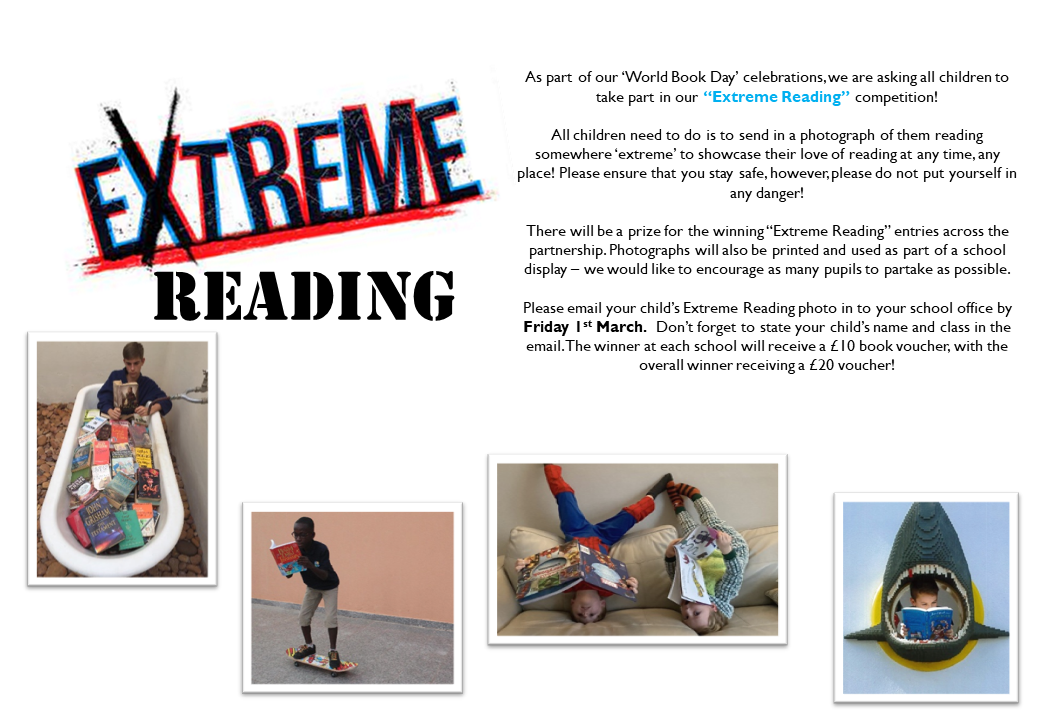 We have two competitions running as part of the day, for all pupils in Years R-6, we are running an 'Extreme Reading' competition! All children need to do is to send in a photograph of them reading somewhere ‘extreme’ to showcase their love of reading at any time, any place! The winner at each partnership school will receive a £10 book voucher, with the overall winner receiving a £20 voucher! Please email your child’s Extreme Reading photo in to your school office by Friday 1st March. Don’t forget to state your child’s name and class in the email.