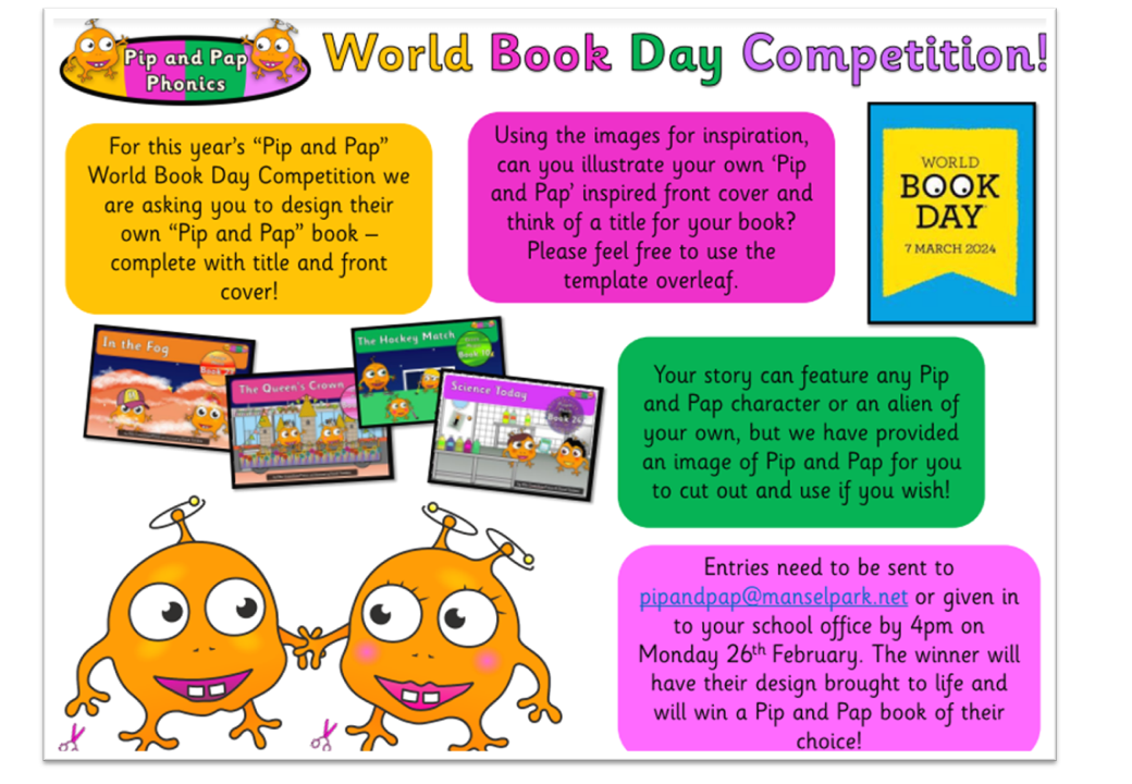 We are also running a Pip and Pap competition for pupils in Years R-2. Children need to design their own Pip and Pap front cover, for their own adventure story, which will be brought to life by series illustrator David Tomkins! This competition closes on Monday 26th February (to give our illustrator time to create the winning design!) and the lucky winner will also receive a Pip and Pap Book of their choice! Please hand your entries into the office or email them in!